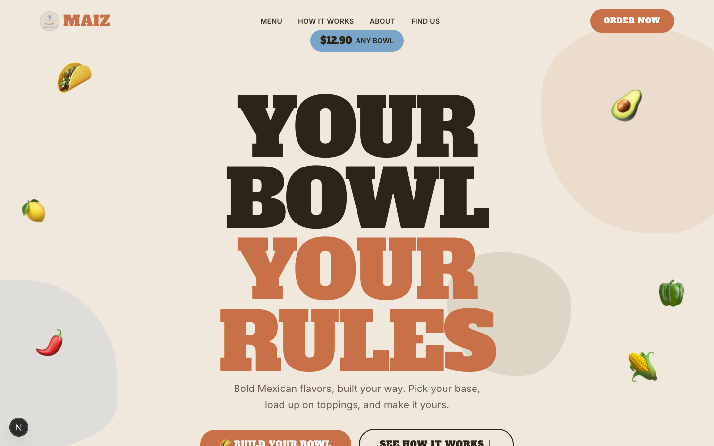 A complete reimagining of MAIZ with an entirely different design direction — warm, playful, and maximalist. Inspired by Feastie.ca's bold approach to restaurant web design, this version embraces organic shapes, earthy tones extracted from real brand photography, and a friendly, approachable personality.